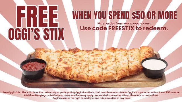 *FREE Oggi's Stix promo code applies to orders from the above order-online button only. It is not applicable to other Third Party delivery providers.